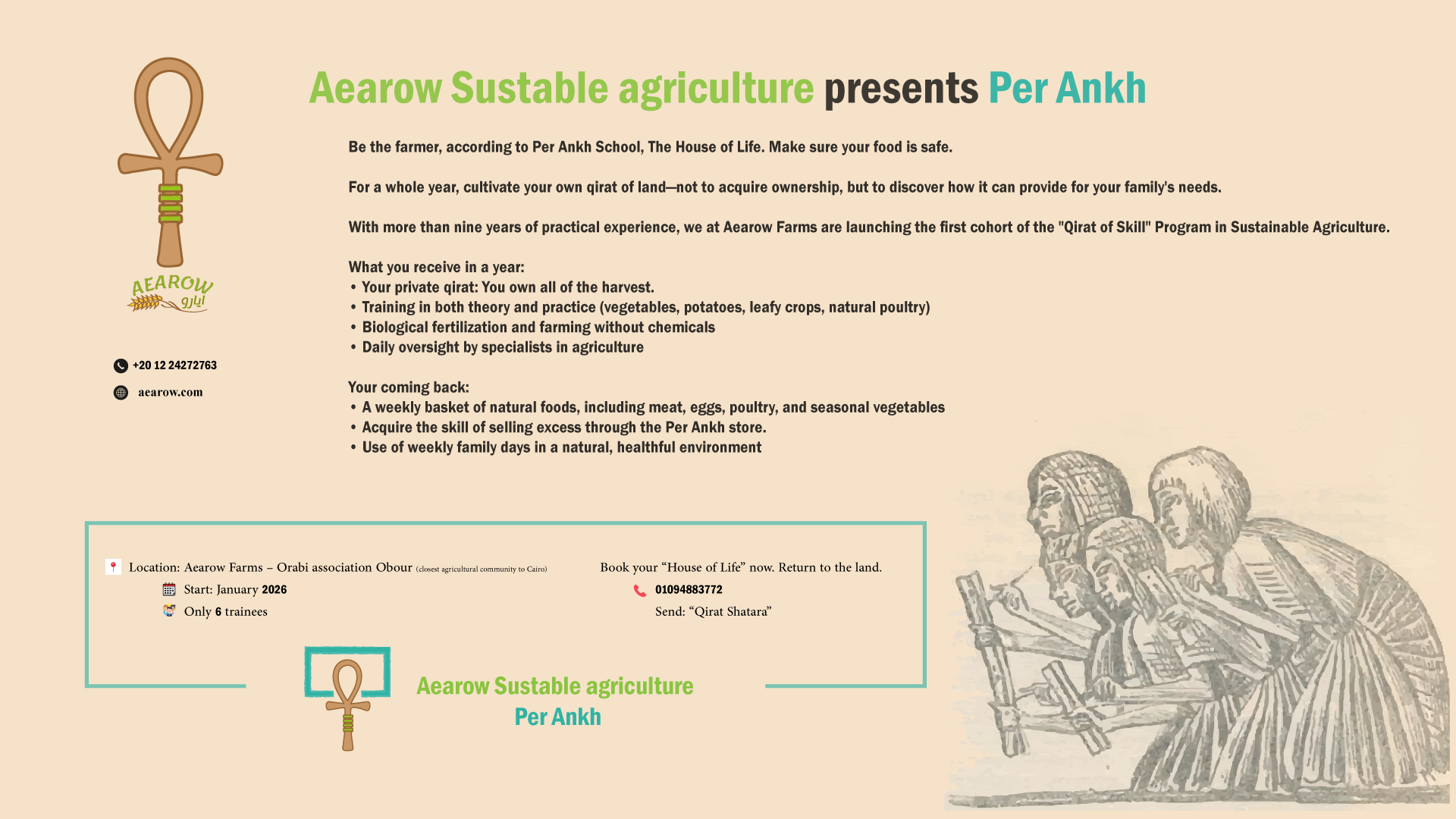 In 2016, our family made the decision to learn agriculture through science and practical experience. We transformed a small plot of land in the Sinai Desert into a paradise (Aearow), producing most of the family’s needs along with the needs of a few other families in environmentally friendly, sustainable ways. In addition, these methods reduce emissions and fix a significant amount of carbon in the soil.